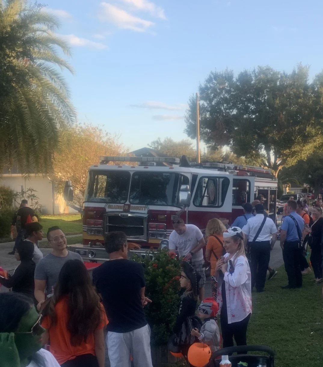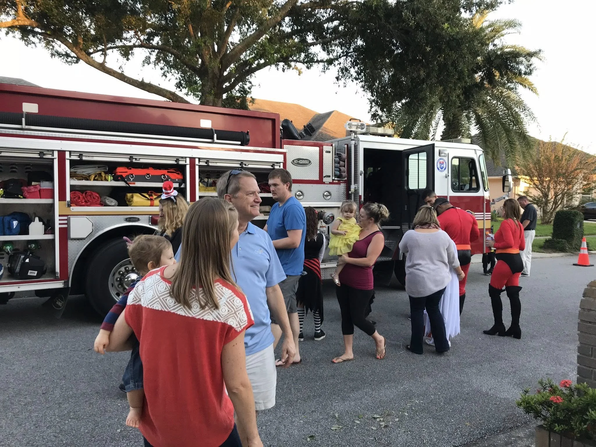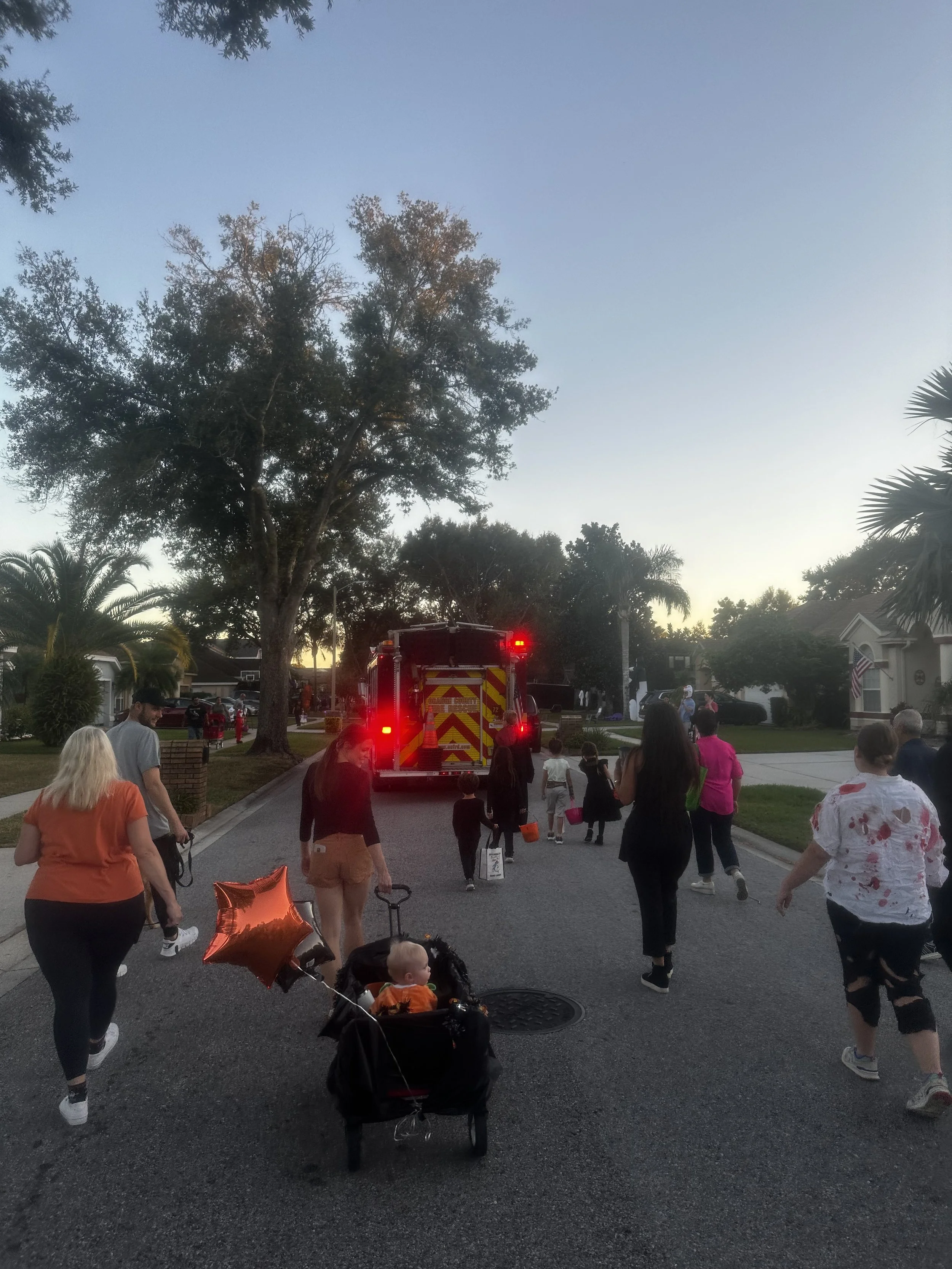 The crowd (slowly!) walks a 1/4 loop behind the fire truck and trick-or-treats along the way! Neighbors post up at the end of their driveways, to allow easy trick-or-treating as the parade passes by.