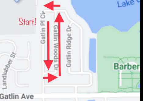 The route is a lit, ~1/4 mile loop within Gatlin Place. We meet in the back of the neighborhood, near the Middle School pass-thru.